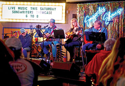 A billboard hung from the stage at Wild Wing Café last Saturday, Feb. 21, casting a glow onto multicolored streamers nearby. A neon sign hung in front of the streamers reflecting the same words plastered across the billboard: “Songwriters Showcase.”