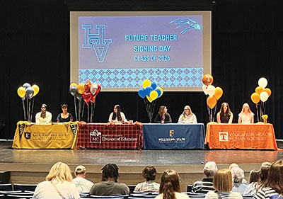 Seven of those students sat at decorated tables onstage, and above them, a large graphic with three words reflected the occasion: Future Teacher Signing Day.
